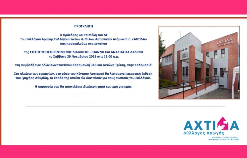 Η δημιουργία της Στέγης Υποστηριζόμενης Διαβίωσης του ΑΧΤΙΔΑ, για άτομα με αυτισμό, ολοκληρώθηκε και με ιδιαίτερη χαρά σας προσκαλούμε στα εγκαίνιά της το Σάββατο 29 Νοεμβρίου 2025 και ώρα 11.00 π.μ., στις εγκαταστάσεις μας στη συμβολή των οδών Κ.Καραμανλή και Α.Τρίτση στην Καλαμαριά.